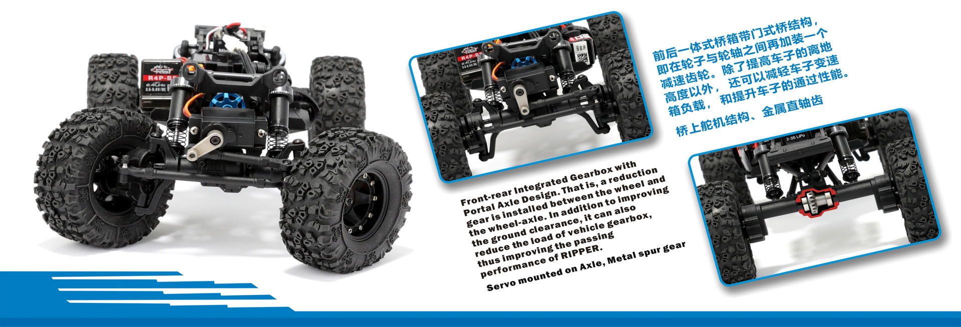 ⚙ 前後一體式橋箱附門式橋結構一個即在輪子與輪軸之間再加裝減速齒輪。除了提高車子的離地高度以外,還可以減輕車子變速和提升車子的通過性能。橋上舵機結構、金屬直軸齒箱負載,